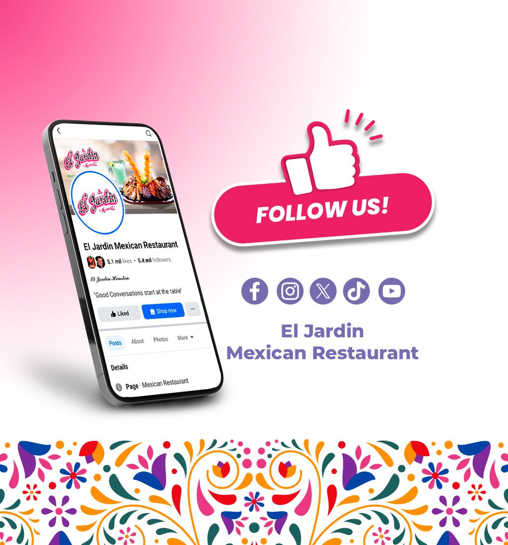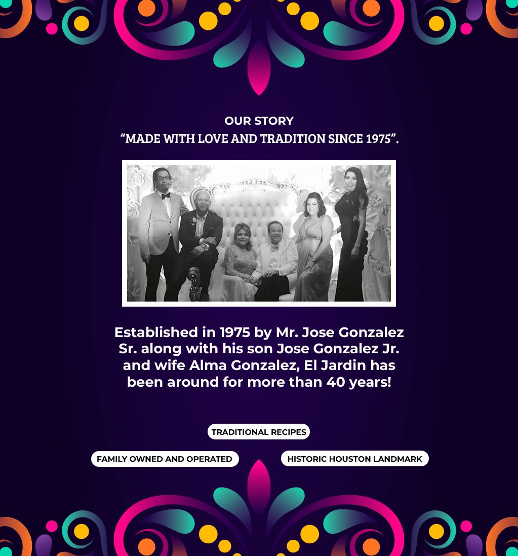 Established in 1975 by Mr. Jose Gonzalez Sr. along with his son Jose Gonzalez Jr. and wife Alma Gonzalez, El Jardin is a historic Houston landmark that has been around for more than forty years and till this day it’s still family owned and operated. Our dishes are made with traditional recipes passed on from Alma’ s mother, Maria Jasso.