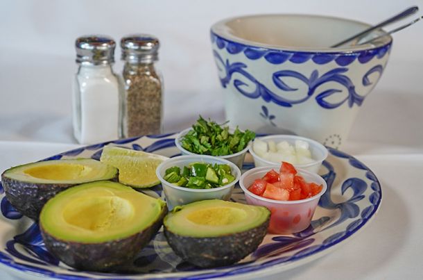 Three Monterrey Jack cheese enchiladas filled with shrimp and crab in a white wine sauce. Served with white rice, charro beans, and sliced avocado.