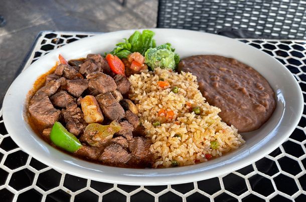 Diced beef fajita sauted in tomato, onion and jalapeño. Served with guacamole, rice and refried beans.