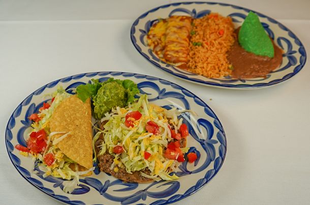 (1) chile con queso tostada, guacamole, (2) ground beef enchiladas served with rice and refried beans.