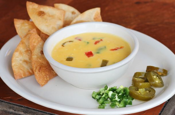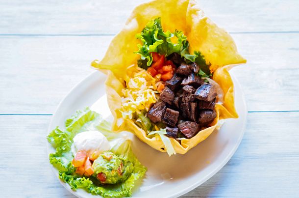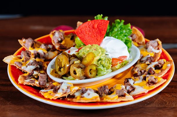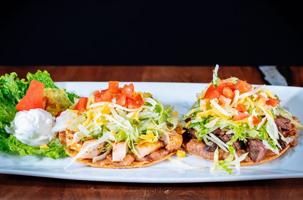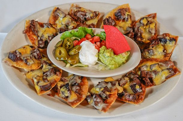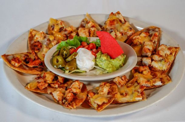 Pieces of chicken or beef fajita covered with American cheese and chile con queso on a fried tortilla. Served with pico de gallo and guacamole.