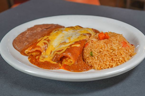 Homemade pork tamales topped with chili gravy and blended cheeses. Served with rice and refried beans.