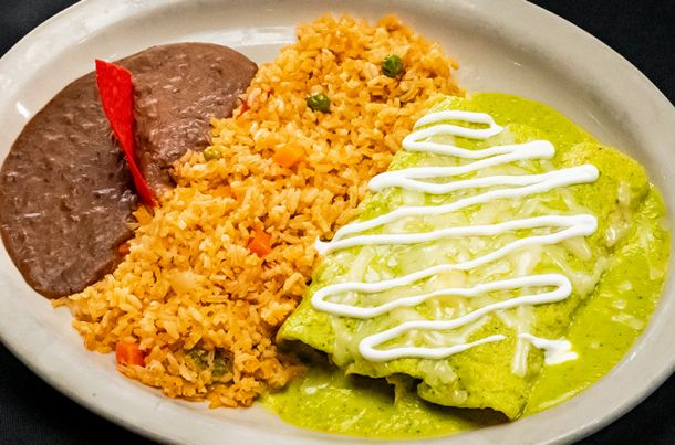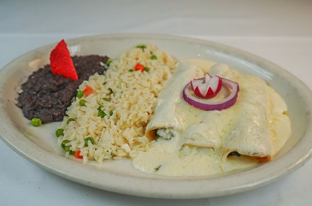 Three spinach enchiladas topped with cream sauce and Monterrey Jack cheese, served with refried beans and white rice.