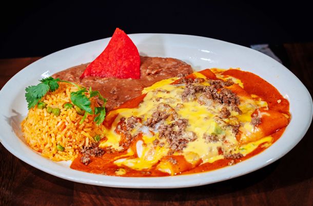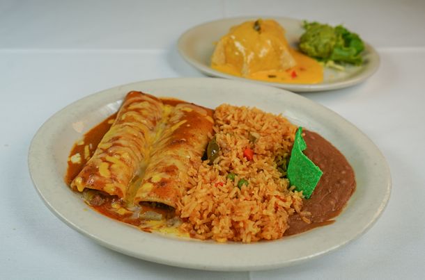 Three ground beef, ranchero chicken or cheese enchiladas topped with Chile con queso sauce and fresh onions.