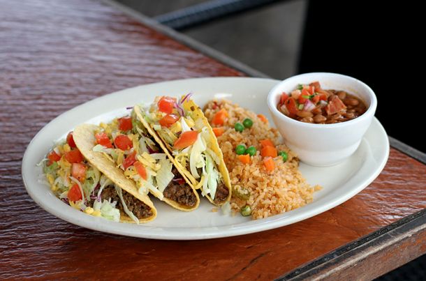 (3) Crispy tacos with ground beef or chicken ranchero served with rice and refried beans
