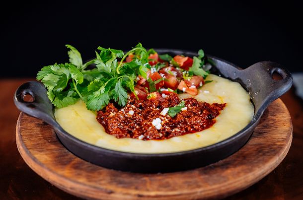 spicy red sauce and queso fresco, served with fried potatoes, chile toreado, lettuce, tomatoes