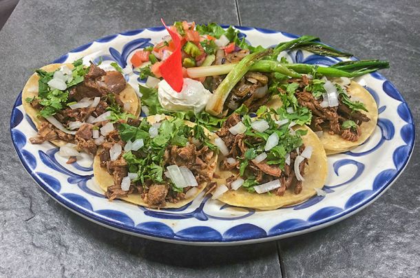 (4) Small corn tortilla tacos withyour choice of carnitas or brisket,served with guacamole, sourcream and charro beans