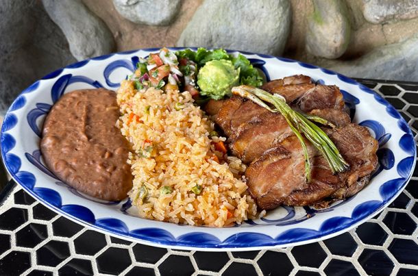 A perfect blend of crispy and tender golden pork served with rice, refried beans, guacamole and pico de gallo.
