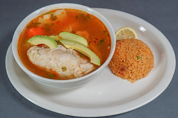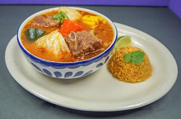 Fresh homemade vegetable soup with shank meat, served with rice and tortillas.