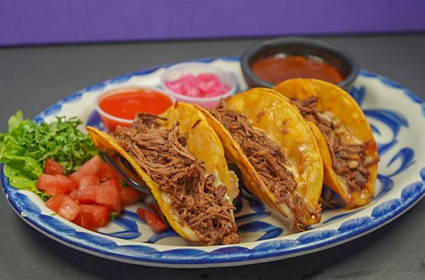 (3) flour or corn tortilla loaded with crispy tripitas , served with guacamole, pico de gallo, rice ans frijoles a la charra.