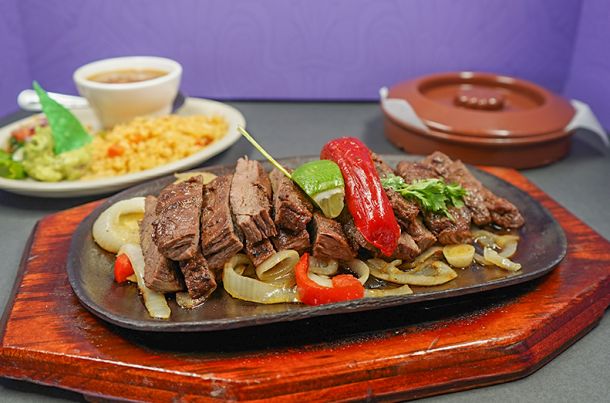 Diced beef fajita sauted in tomato, onion and jalapeño. Served with guacamole, rice and refried beans.