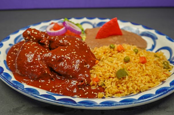 Three chicken enchiladas topped with our traditional mole sauce and sour cream.