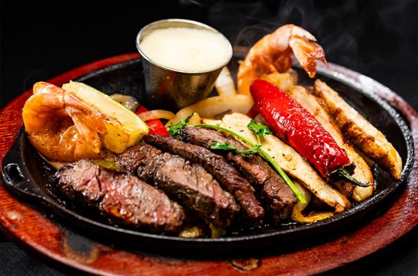 Beef fajita, chicken fajita, carnitas and (8) jumbo shrimp